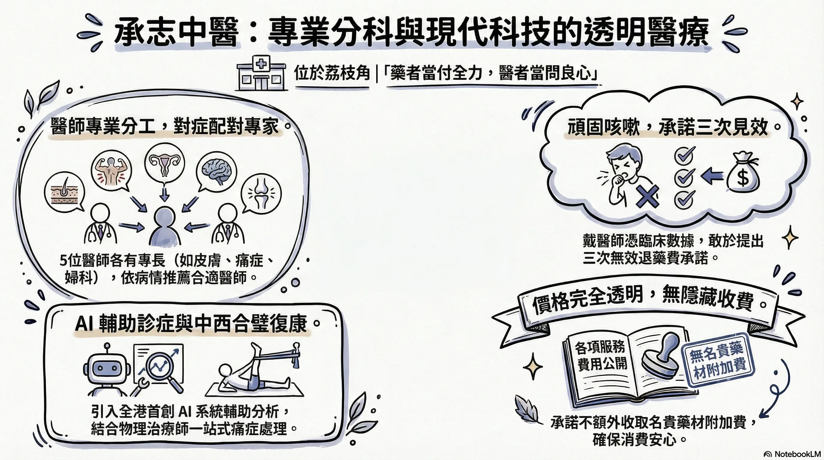 最大的分別在於:(1) 明確的專科分工——五位醫師各有專長,不是隨便安排;(2) 咳嗽三次見效承諾——這在行業中非常罕見;(3) AI 輔助診症——以科技提升傳統醫術的準確度;(4) 中醫 + 物理治療一站式服務;(5) 完全透明的收費制度。當然,最適合你的診所取決於你的具體需求和情況。